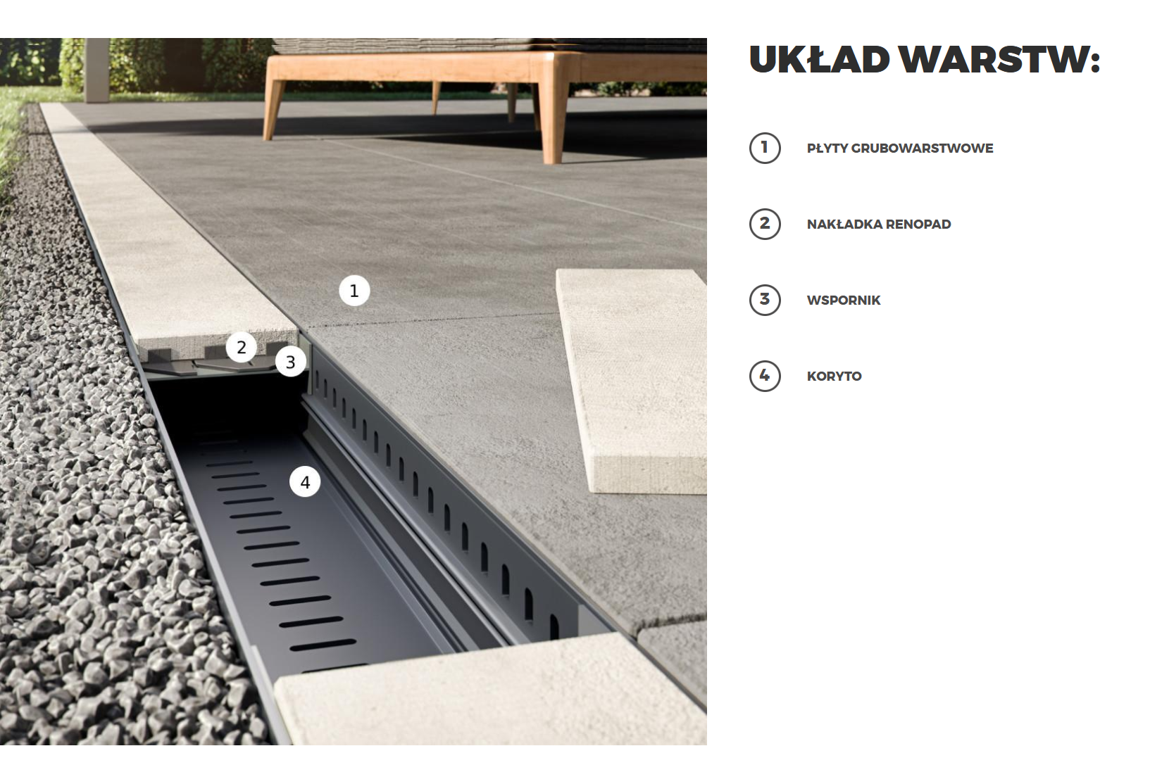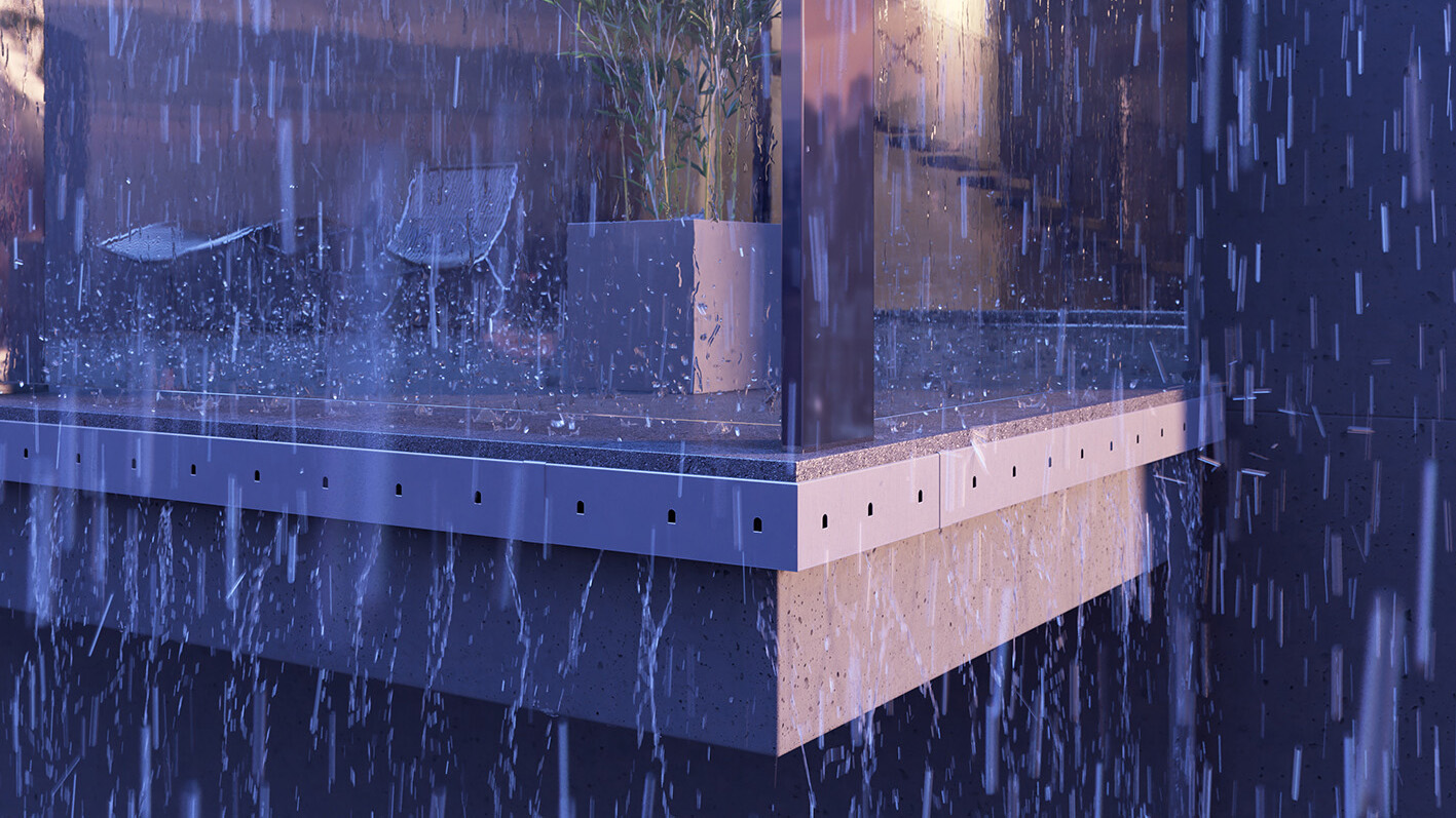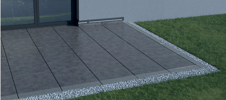 Odwodnienia liniowe RENODRAIN S, umożliwiają odprowadzenie wody opadowej z tarasu naziemnego z posadzką wentylowaną, kiedy taras jest wykonany w poziomie otaczającego go terenu. Innowacyjna budowa odwodnienia RENODRAIN S, powoduje pełną integrację z posadzką tarasu, powodując że jest ono niewidoczne, gdyż przykrycie wykonujemy z przyciętych na odpowiednią szerokość płyt posadzkowych.