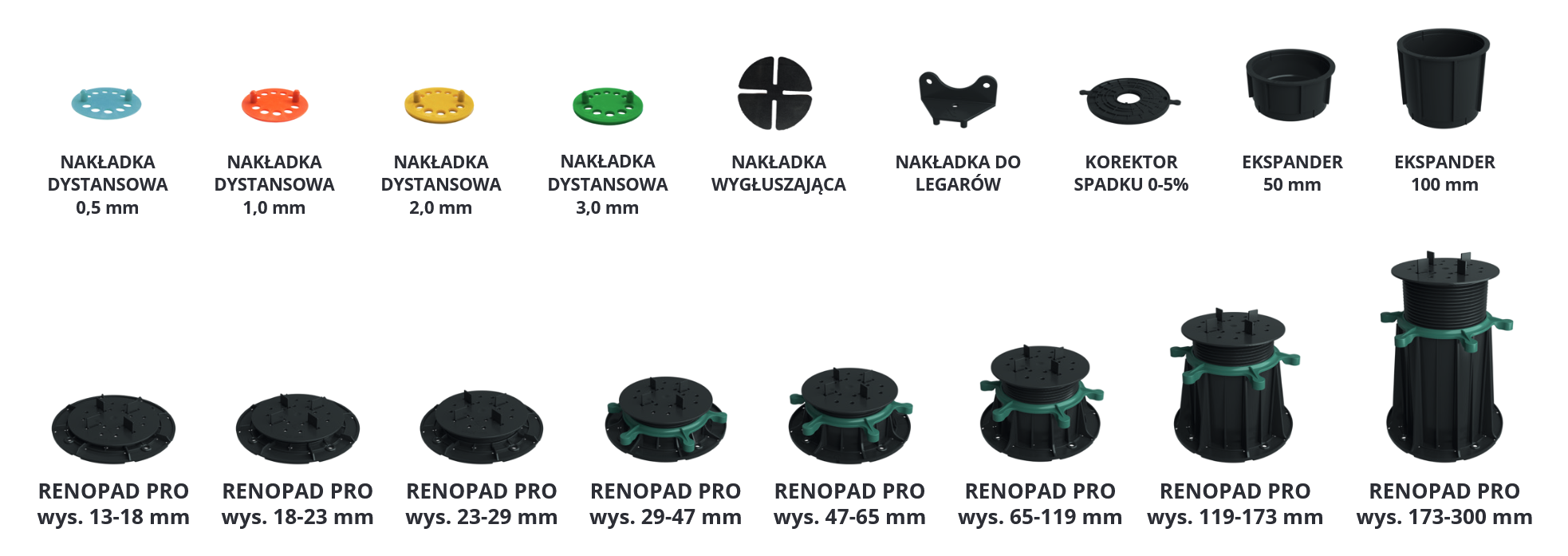 Przeznaczeniem wsporników Renopad Pro są posadzki wentylowane. Dzięki wymiennej głowicy można stosować je zarówno przy płytach grubowarstwowych jak i deskach tarasowych. Występują w 8 rozmiarach, które umożliwiają podniesienie posadzki w zakresie 13-300 mm.