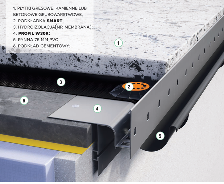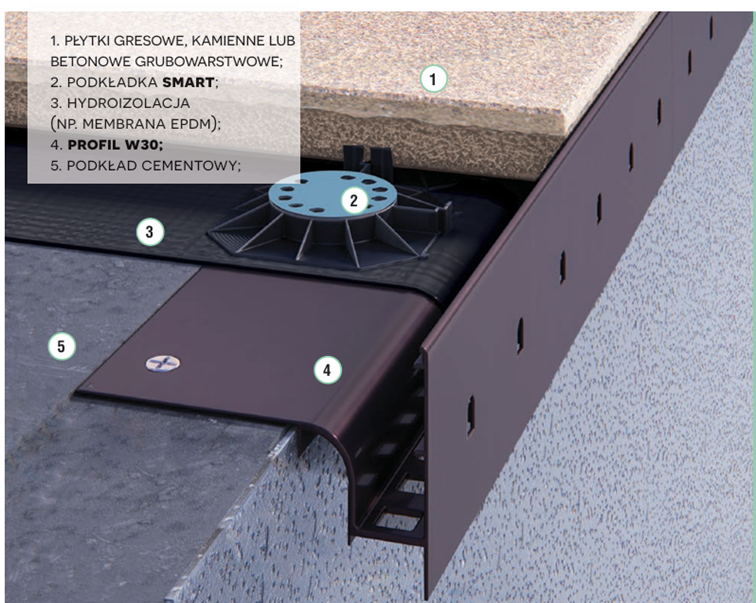 Podstawowy system na podkładkach nieregulowanych SMART z opcją montażu rynny PVC (W30R) lub aluminiowej (W30R+)