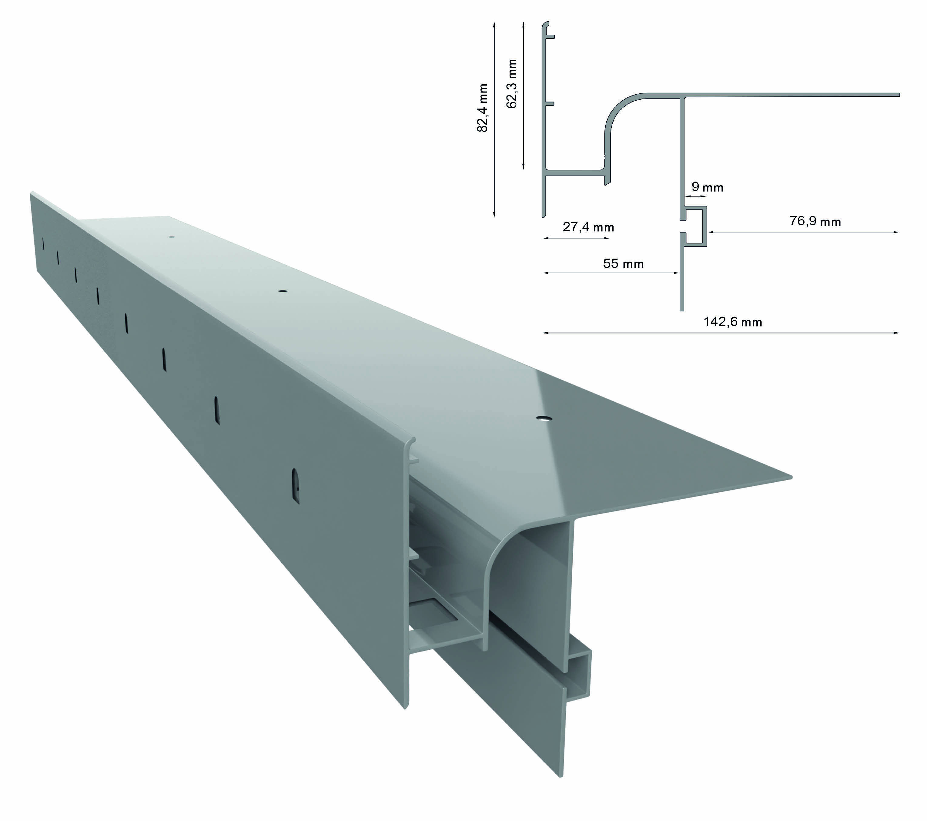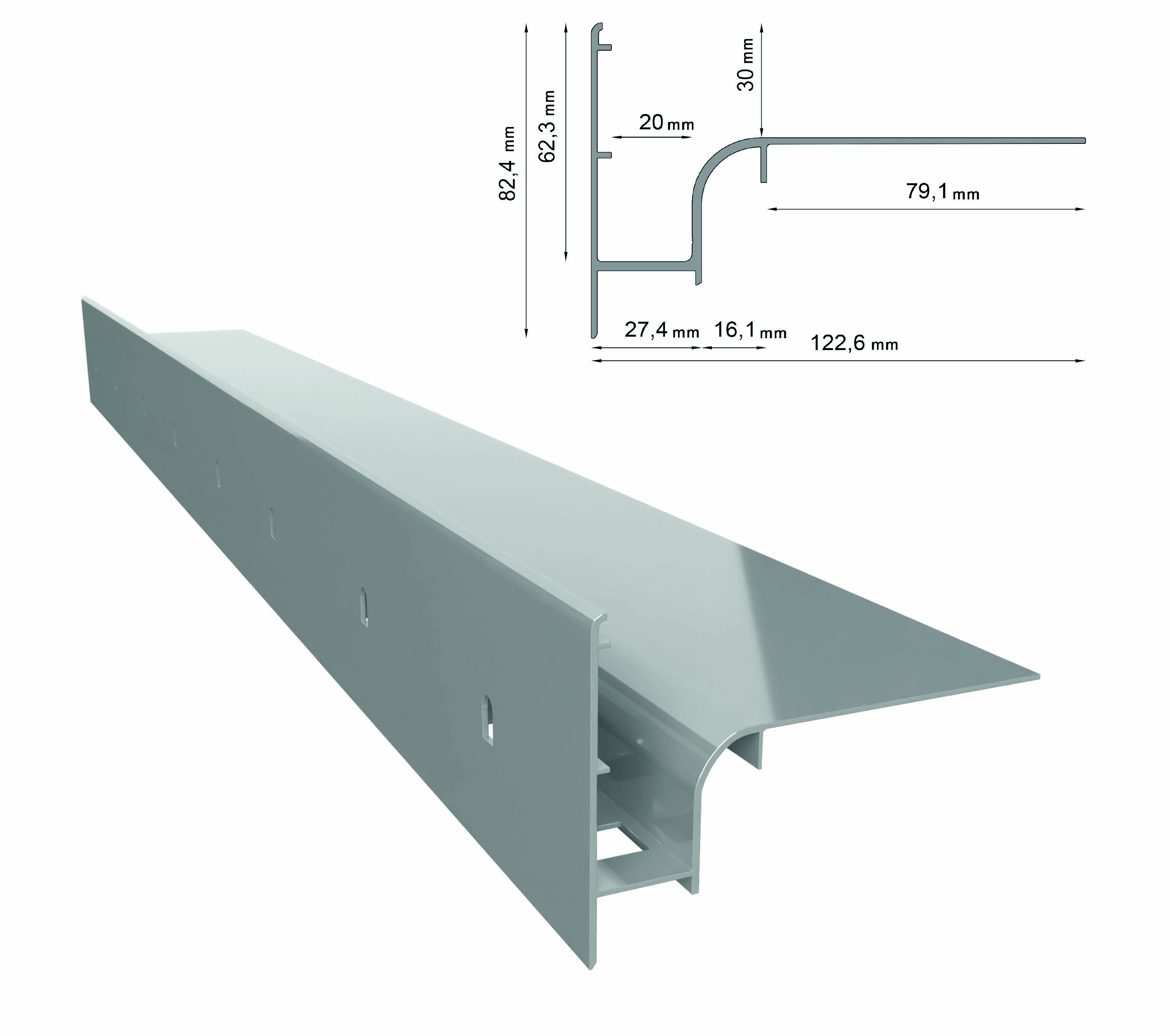 Profil z dużymi otworami odwadnaijącymi z możliwością montażu rynny PVC 75 mm. Wersja W30R+ przeznaczona jest to montażu aluminiowej rynny R50 lub RK65 dostępnej w naszej ofercie